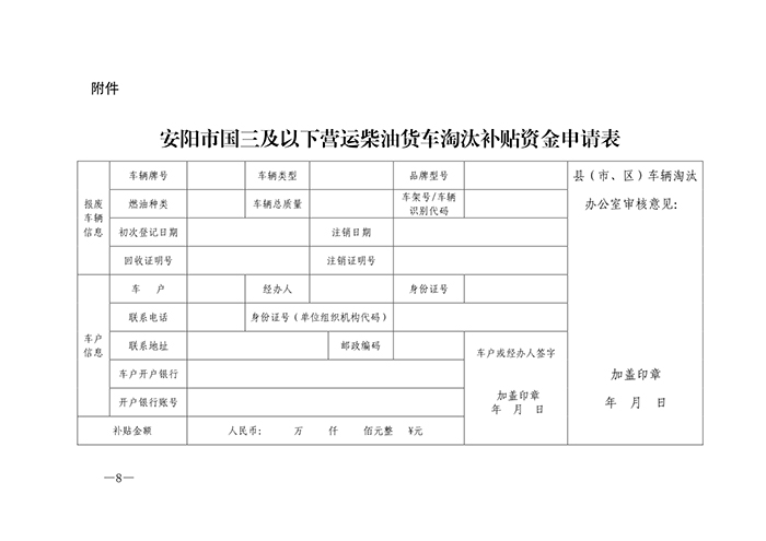 關于印發安陽市國三及以下排放標準營運柴油貨車淘汰補貼辦法的通知